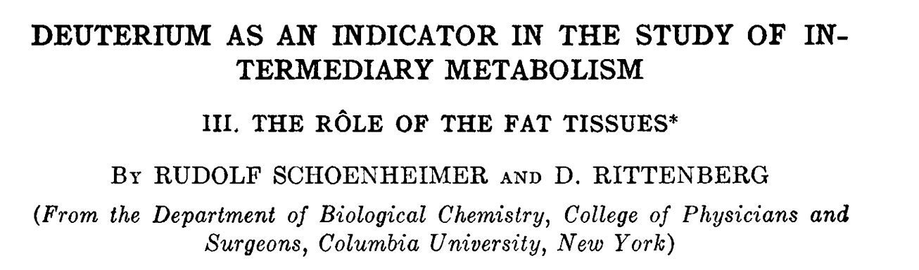 Schoenheimer and Rittenber’s breakthrough was the use of deuterium—a heavy form of hydrogen—as a tracer to study intermediate metabolism. Schoenheimer was a German Jew who had been forced out of his academic position in Frieberg in 1933 and emigrated to the U.S., where he gone to work in Harold Urey's department at Columbia University.
