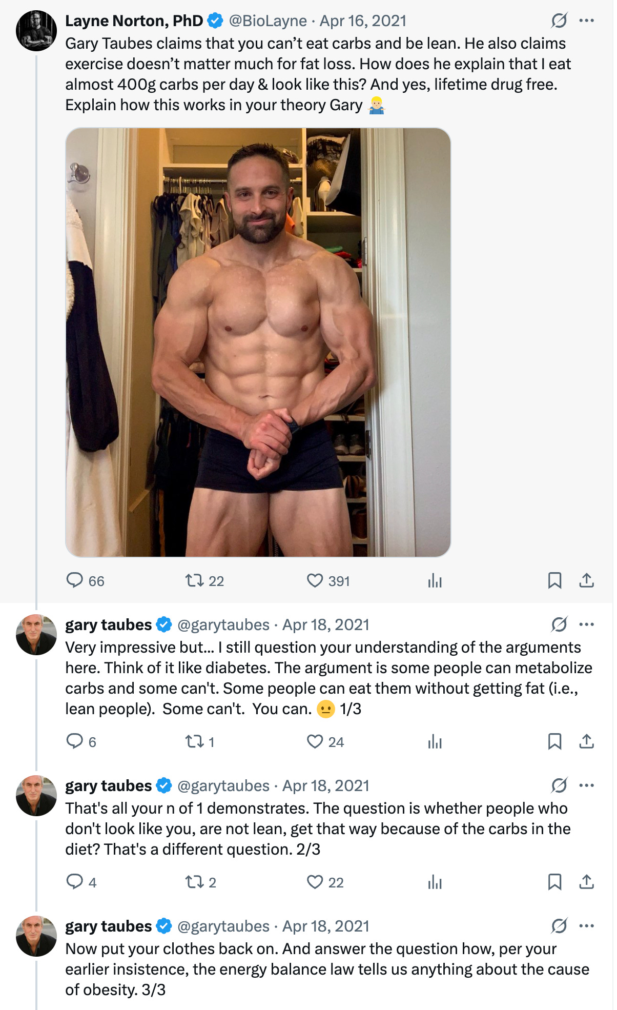 Norton chose not to respond to my last question about energy balance, which is when I muted him, although not why. I would have preferred to continue discussing the science and our points of disagreement. I’m averse, however, to having strangers (or friends, for that fact) sending me photos of how they look in their underwear, whether they’re trolling me, as Norton was, or not.